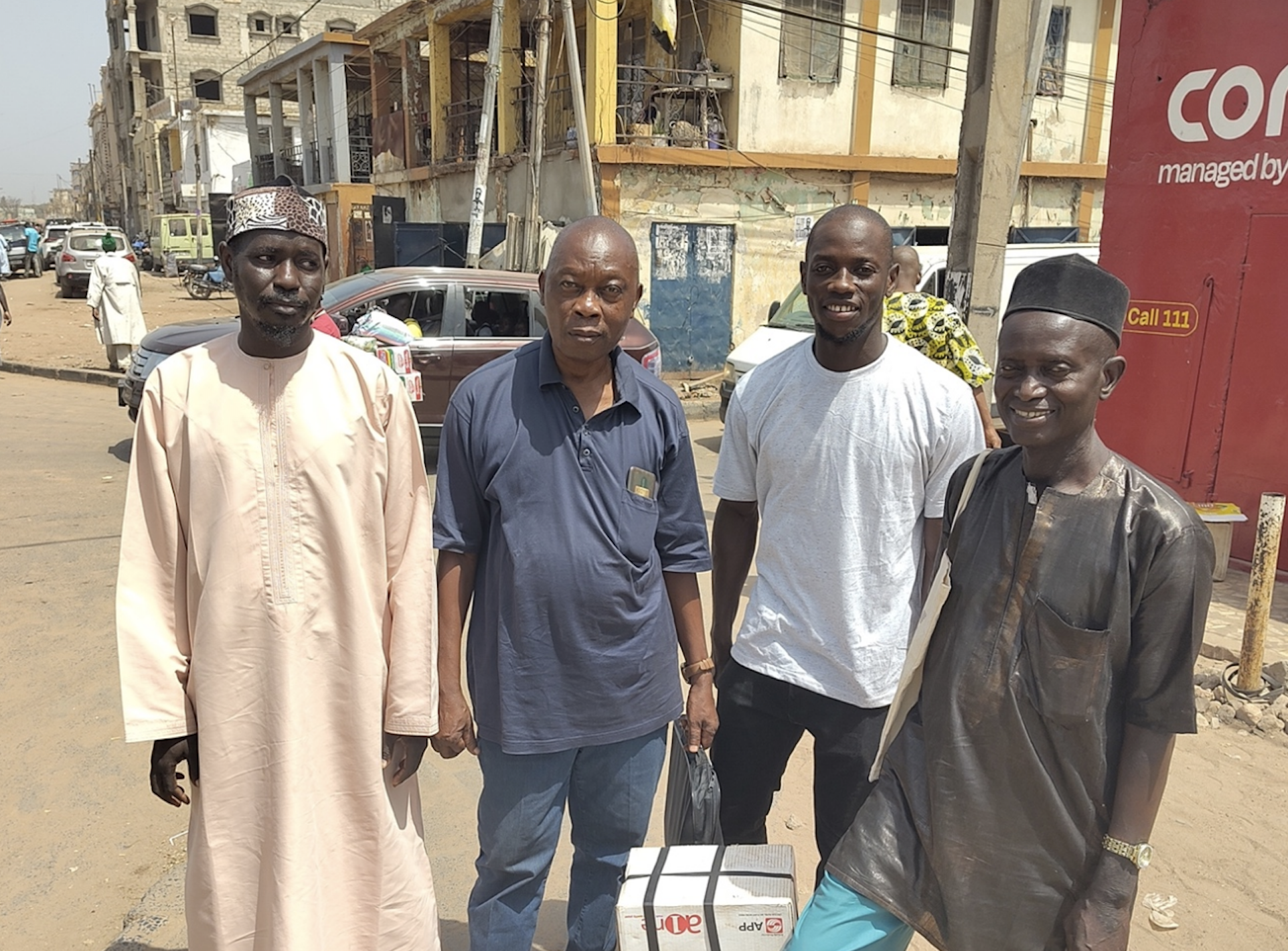 ● Die ersten 450 Exemplare des Science Books konnten bereits während meines Besuchs gekauft werden. Der Leiter des naturwissenschaftlichen Bereichs, Herr Sarr, der Lehrer, Herr Sonko, und der Leiter der Schulbibliothek, Herr Manneh, holten sie beim Autor des Buches, Herrn Ngebga (2. von links), ab.
